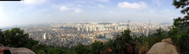 So now that we're all caught up, we'll talk about what I did today! After breakfast, my host dad wanted to take me hiking at 9am. I had planned to study and sleep all day, but this was a much better idea haha. We went to Yongmasan Mountain, about 20 minutes by subway from my place and one stop away from my school (you can actually see Daewon from the mountaintop). Needless to say, the view was spectacular and overlooked a part of downtown Seoul.
